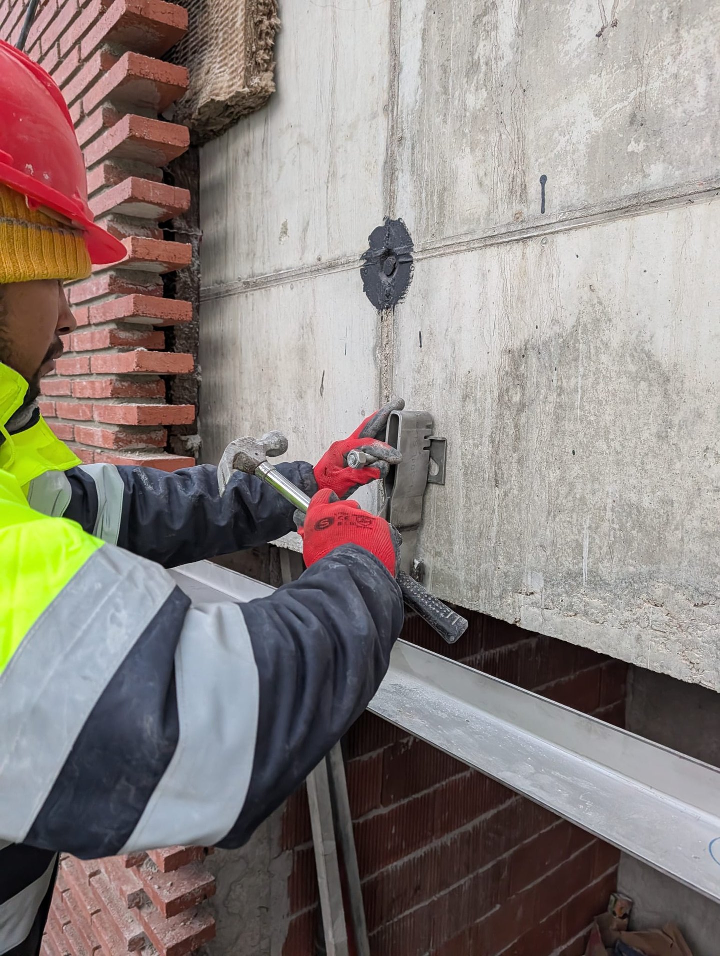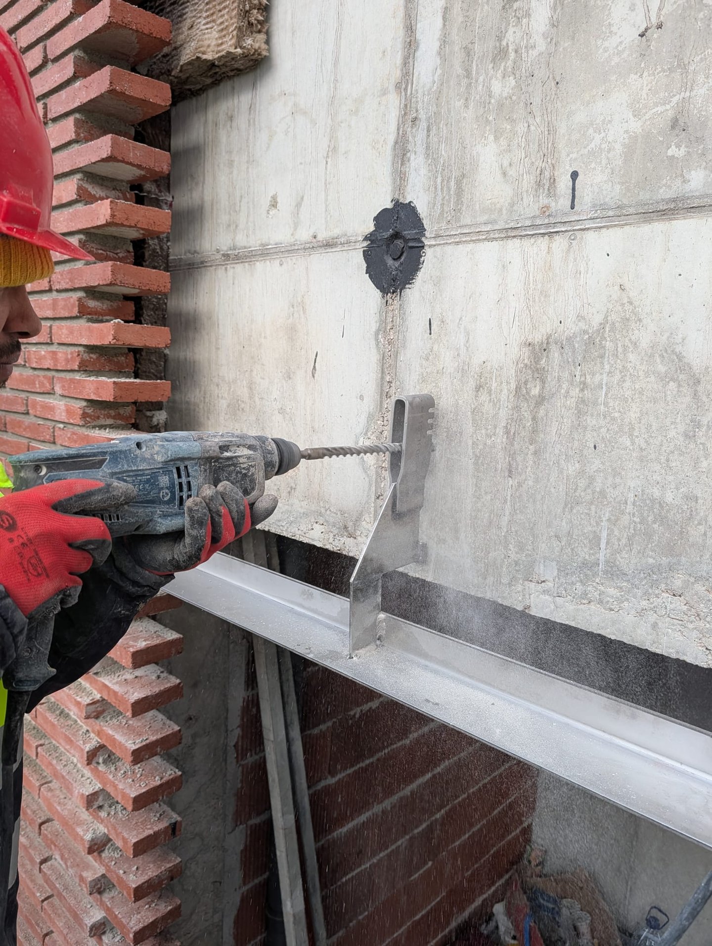 Depois de definida a posição da cantoneira, procede-se à perfuração do suporte estrutural para instalação das ancoragens M16.
