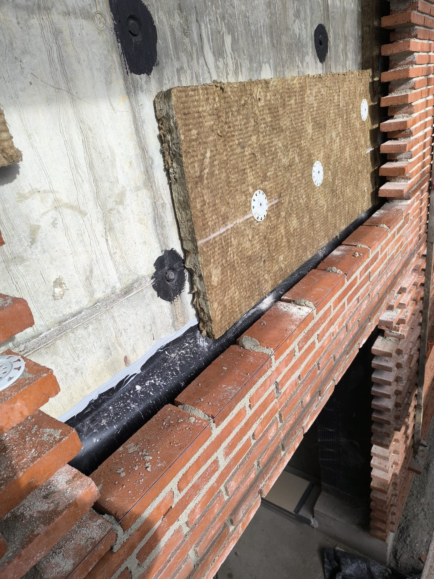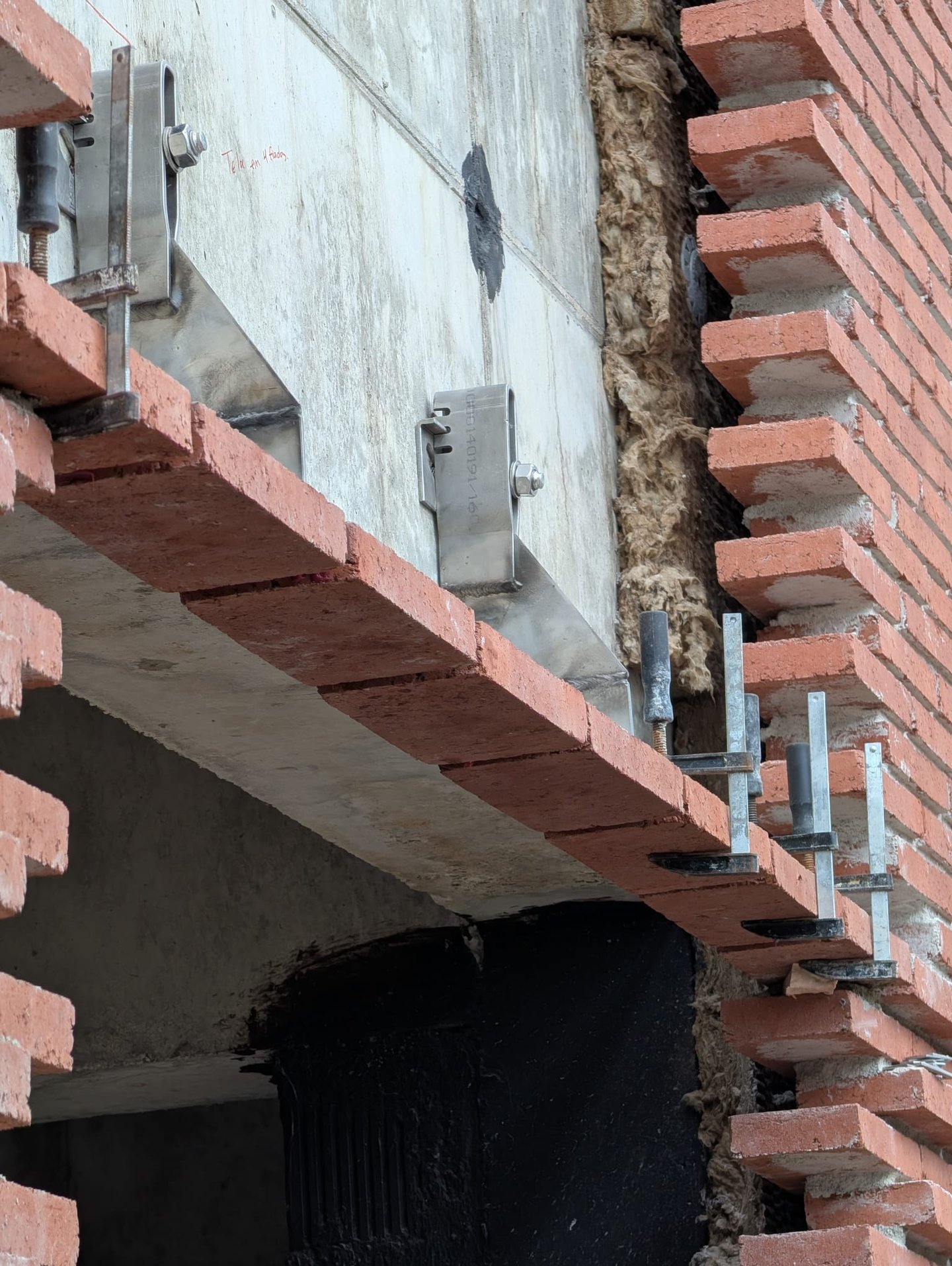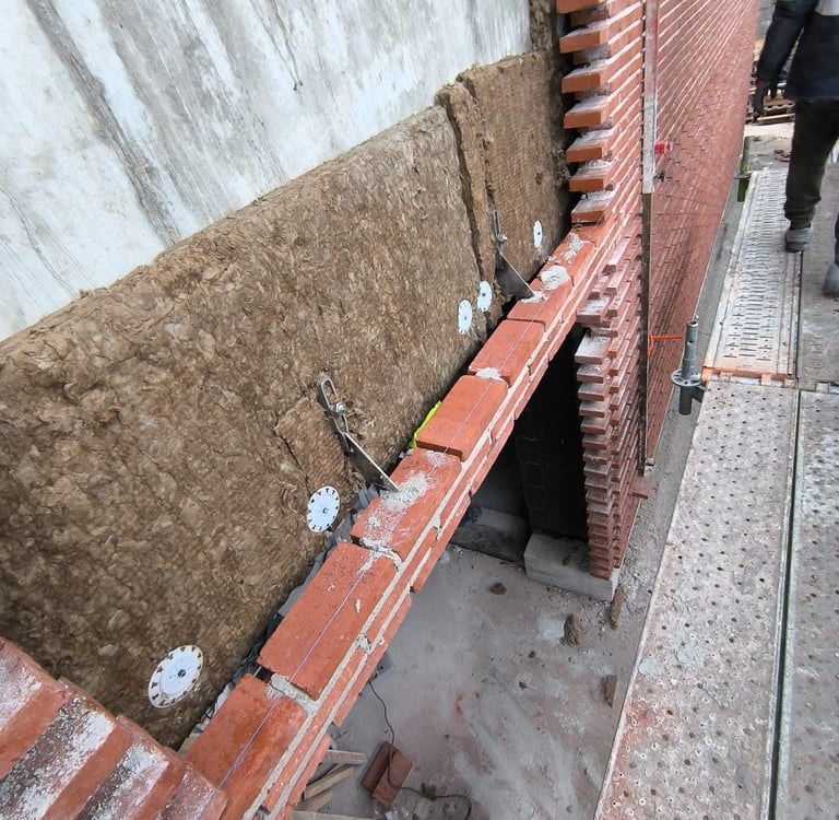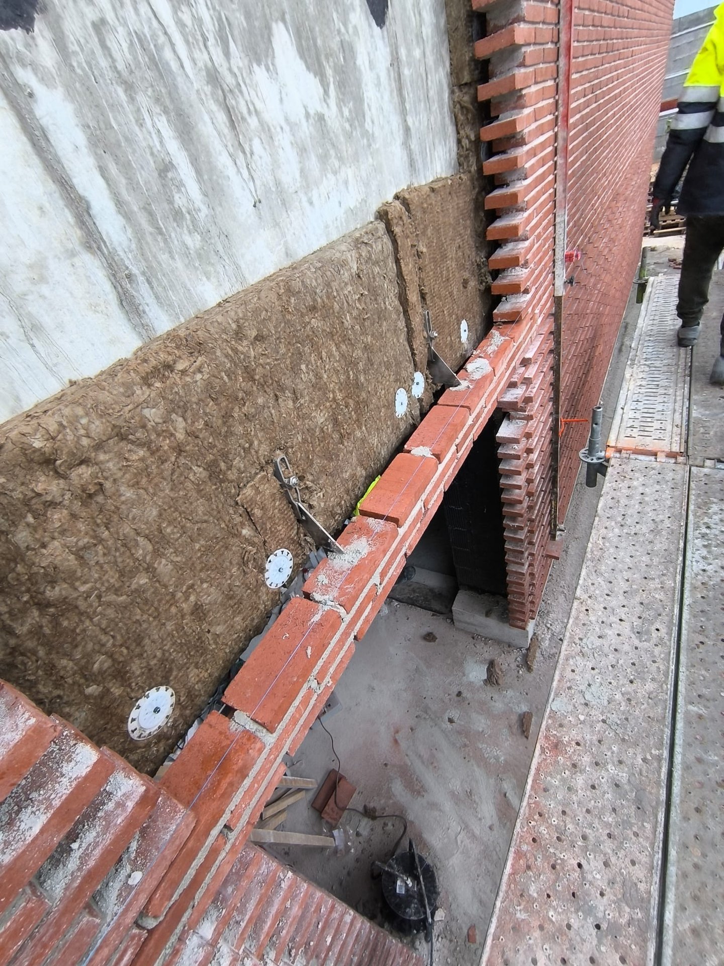 Nesta fase começam a ser utilizados grampos de ligação à parede interior, garantindo a estabilidade do revestimento em tijolo.
