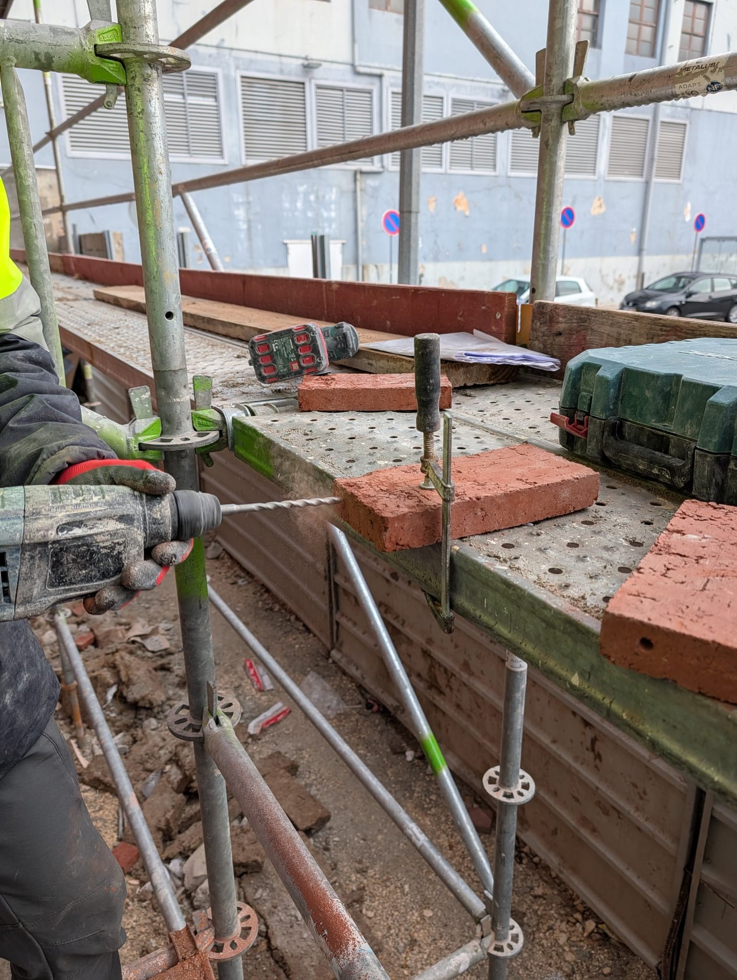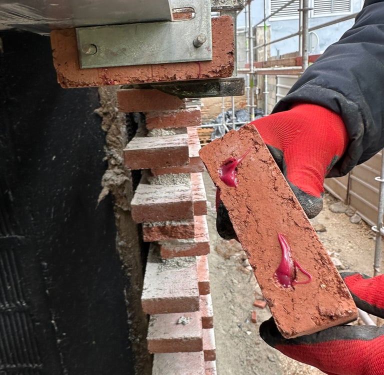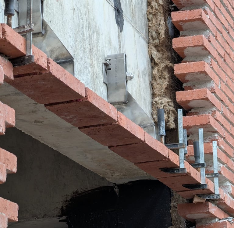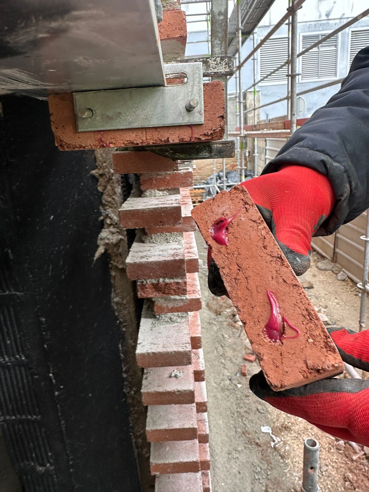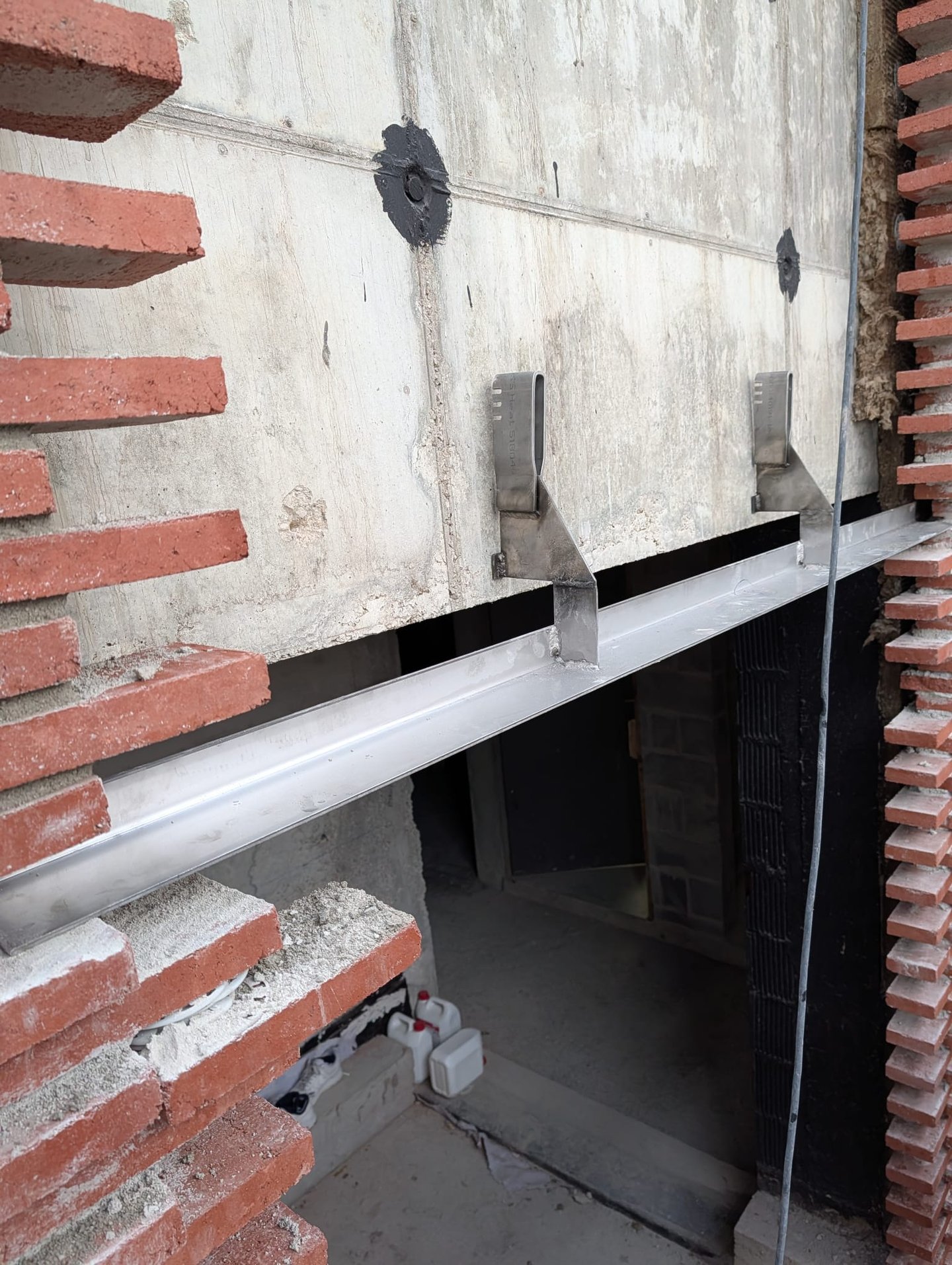 Nesta fase começam a ser utilizados grampos de ligação à parede interior, garantindo a estabilidade do revestimento em tijolo.