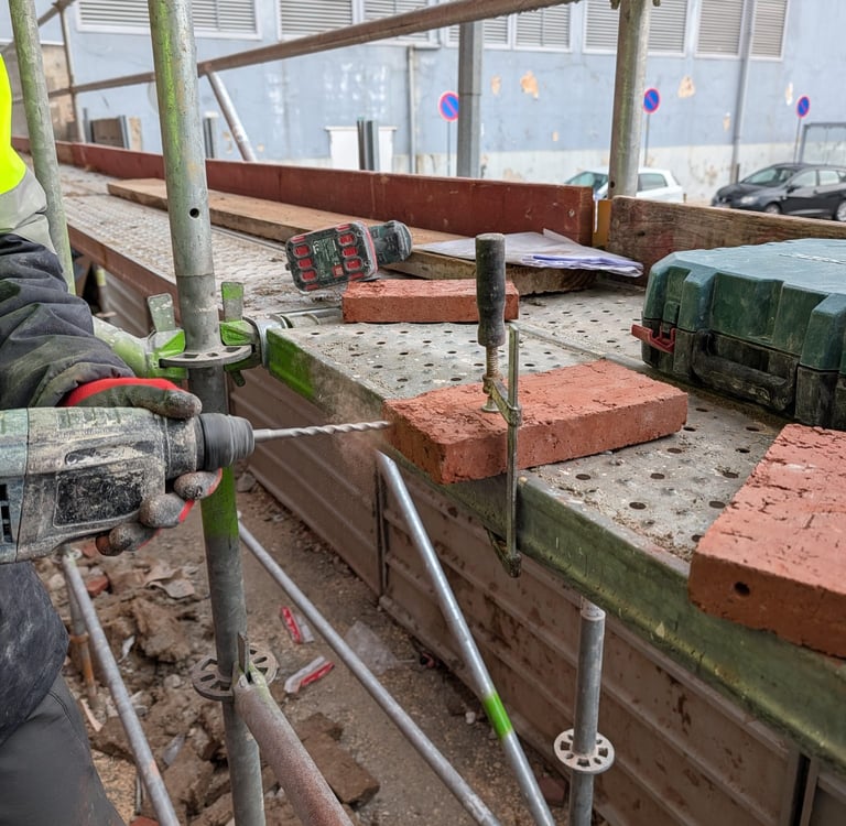 Após a perfuração, aplica-se bucha química no interior do furo, criando uma ancoragem resistente entre o elemento metálico e o tijolo.